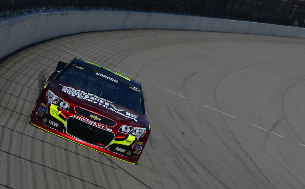 Gordon started 35th and gained 10 spots in the first 10 laps of the race. His progress slowed as he moved to 23rd by lap 16. Gordon entered the top-20 on lap 21 and ran 18th when the competition caution waved on lap 25. Pit stops followed with Gordon restarting in 19th place on lap 30. He moved up to 15th within 5 laps of the green flag and ran in 13th when a debris caution slowed the field on lap 46. Pit stops followed and Gordon restarted 12th. He gained a spot and ran 11th when the caution waved on lap 61 for Austin Dillon’s cut tire and subsequent spin. Pit stops ensued with Gordon exiting in 13th place. He entered the top-10 on lap 85 with a move around Ryan Newman, and took 9th from David Ragan one lap later. Landon Cassill’s engine brought out the caution on lap 95. Gordon held the 9th spot through the round of pit stops. On the restart, Gordon used the inside line to his advantage and moved to 8th. He took 7th from Carl Edwards on lap 109, and dispatched of Kasey Kahne on lap 112. However, Jimmie Johnson went by to send Gordon back to 7th on lap 120. He faded back to 8th on lap 124 after Edwards passed. Three laps later, Kahne went by to send Gordon to 9th place. He slipped out of the top-10 on lap 131 prior to a round of green flag pit stops.