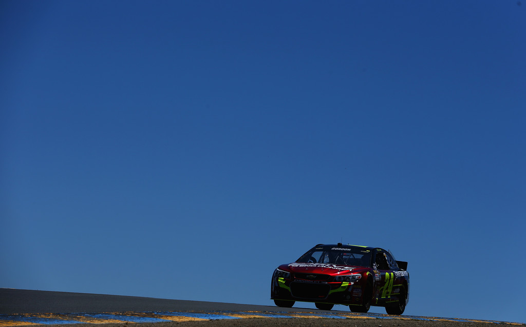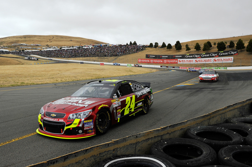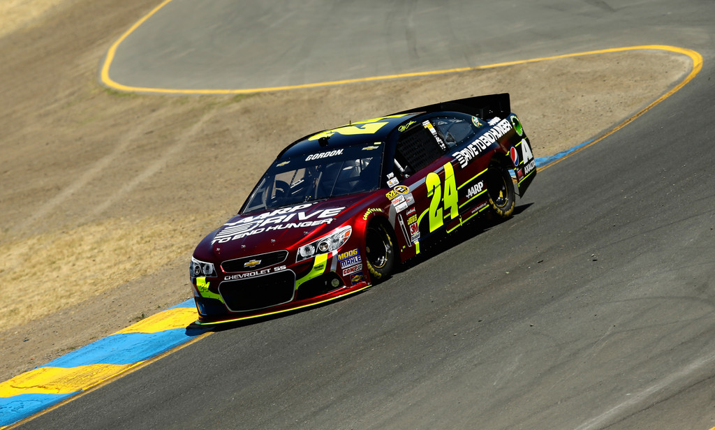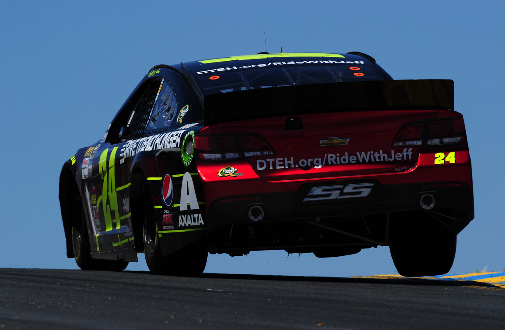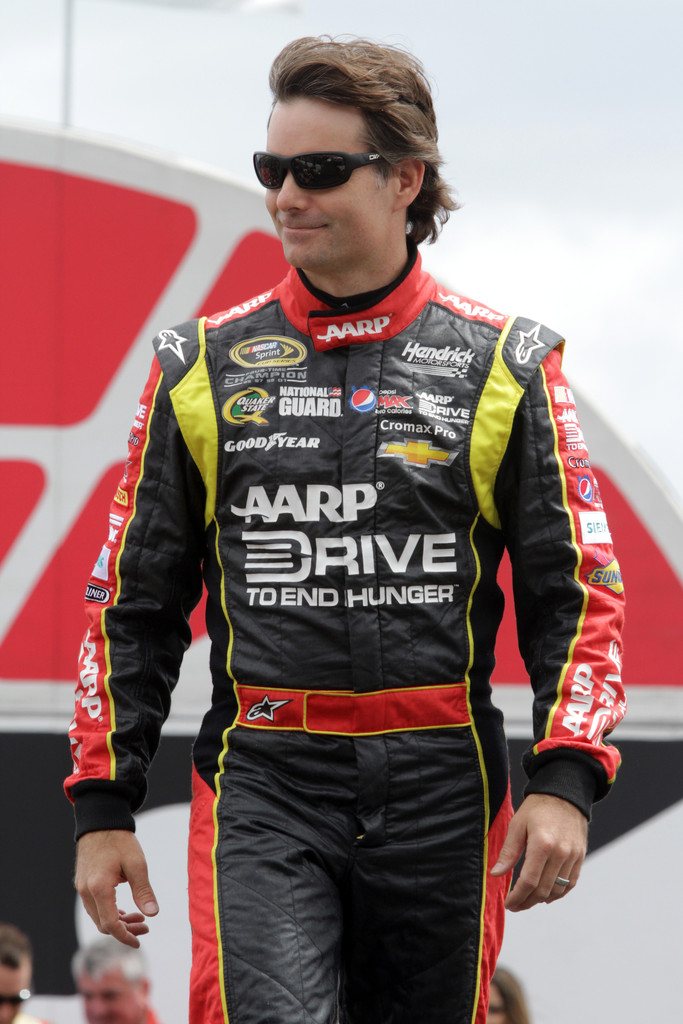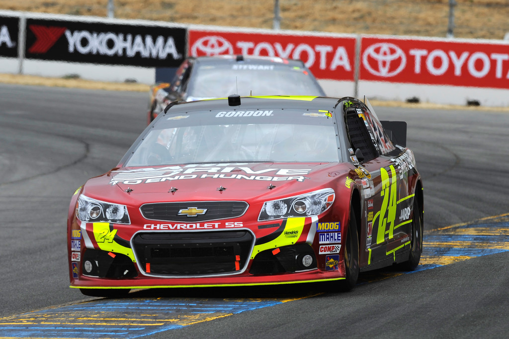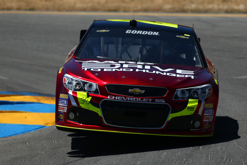 He moved around Kenseth to take 6th on lap 162 and re-entered the top-5 with a move around Kyle Busch two laps later. He passed Keselowski for 4th on lap 172 as he tried to pad his cushion to the Chase cutoff. A caution for Austin Dillon’s cut tire on lap 183 brought pit stops. Gordon lost 2 spots on pit road and restarted in 6th place. He passed Truex for 5th prior to a debris caution on lap 200. Gordon dropped to 8th on the restart before Josh Wise’s crash brought a caution on lap 206. On the restart, Kyle Busch got loose and collected Clint Bowyer and Cole Whitt to bring out a caution. Gordon restarted in 7th place on lap 220. He re-entered the top-5 after passing Ryan Newman and Kurt Busch. With 78 to go, Jimmie Johnson slammed the wall to bring out a caution. Gordon took 2 tires and restarted on the inside of the front row along side race leader Kevin Harvick. Jamie McMurray’s spin one lap after the restart brought out a caution. Gordon once again restarted inside of Harvick. He dropped more than 5 seconds behind Harvick, but held 2nd place until a debris caution with 25 laps to go.